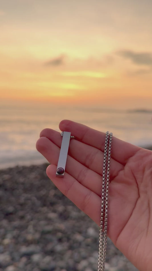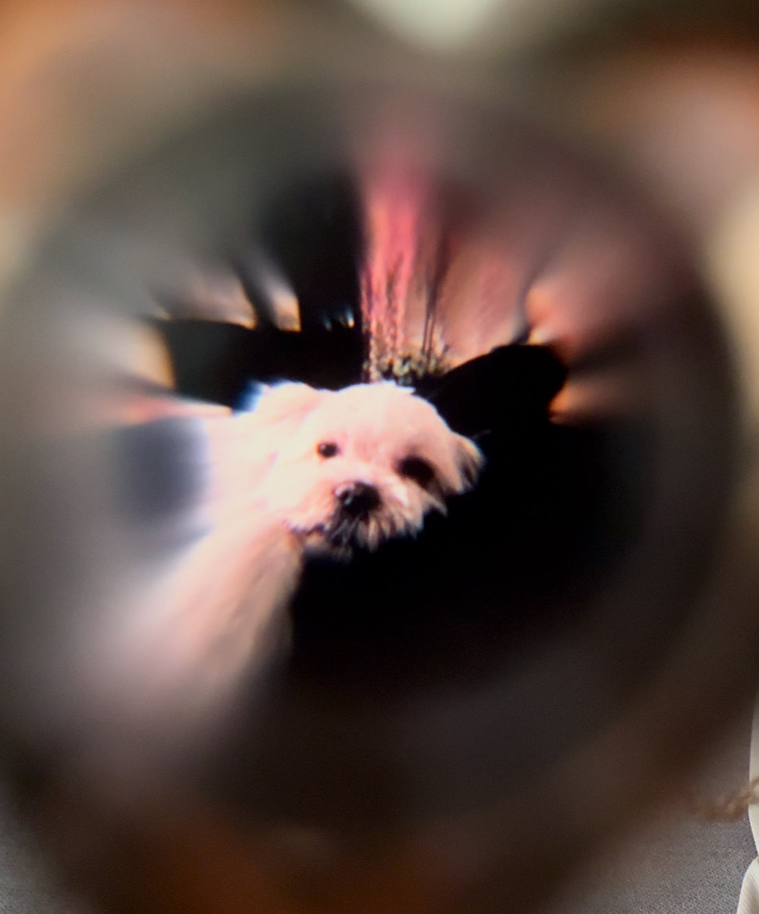 1. En un lugar con iluminación acercar el ojo a la bolita del centro del collar.
